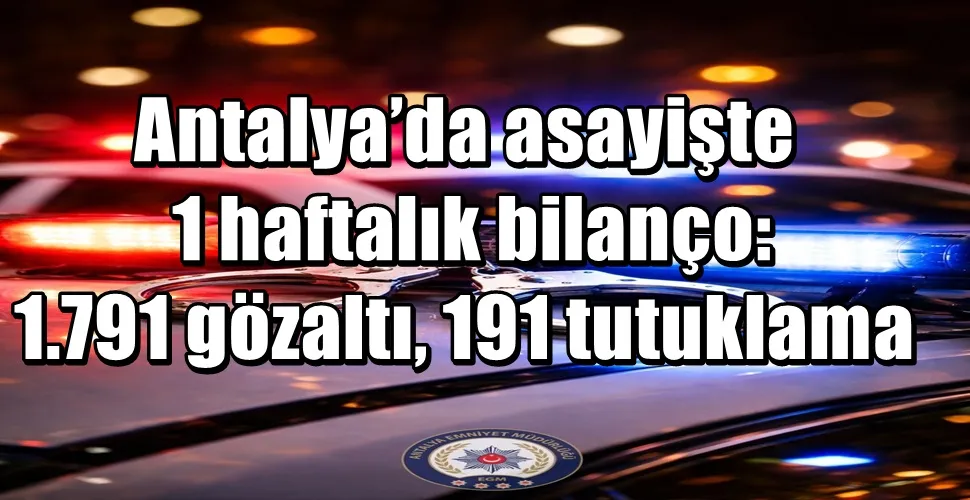 Antalya Emniyet Müdürlüğü Asayiş birimleri, kent genelinde son bir haftada yoğun denetim ve operasyonlar gerçekleştirdi. Yapılan çalışmalarda 203 bin 174 kişi hakkında sorgulama yapılırken, 538’i aranan olmak üzere toplam 1.791 kişi yakalandı. Yakalanan şüphelilerden 191’i tutuklandı.