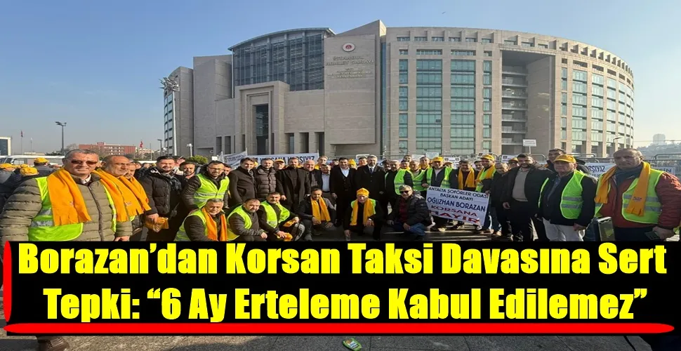 Antalya Şoförler Odası Başkan Adayı Oğuzhan Borazan, İstanbul’da görülen korsan taksicilik davasına katıldı. Kalabalık bir esnaf grubuyla birlikte mahkemeyi takip eden Borazan, davanın 6 ay sonraya ertelenmesine sert tepki gösterdi.