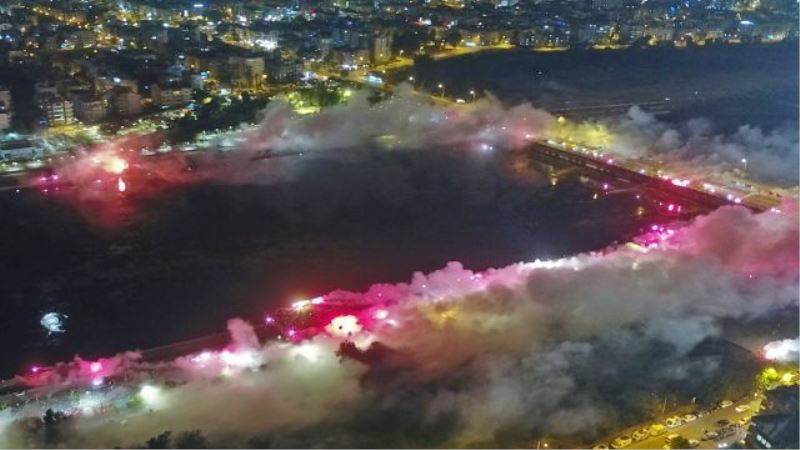 Saatler 22.00’ı gösterdiğinde ise taraftarlar Boğaçayı Köprüsü etrafında meşaleleri yakarak görsel şölen oluşturdu. Kırmızı-Beyazlılar havai fişek gösterisi ile geceyi aydınlattı. Antalyasporlu taraftarlar bu sırada tezahüratlarda bulunarak kulübe olan sevgilerini dile getirdi.