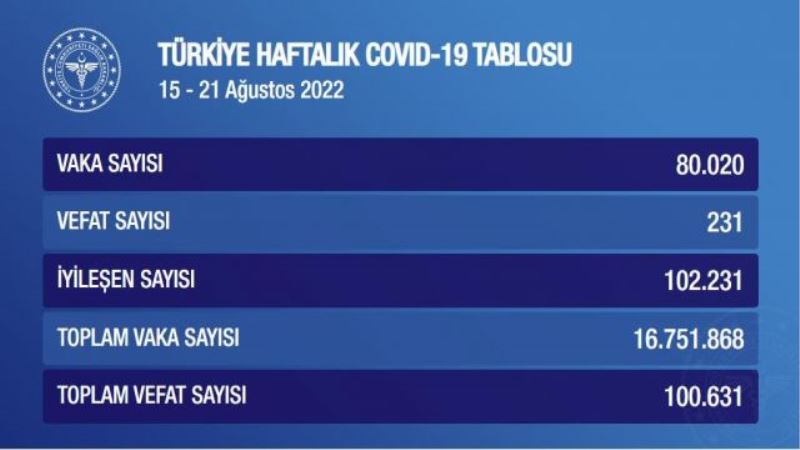 Sağlık Bakanlığı’nın bugün yayınladığı ‘Türkiye Haftalık Covid-19 Tablosu’, 15-21 Ağustos 2022 tarihleri arasını kapsıyor. Bu hafta içerisinde 80 bin 20 vaka ortaya çıkarken 231 kişi yaşamını yitirdi, 102 bin 231 kişi ise iyileşti. Türkiye’deki toplam vaka sayısı 16 milyon 751 bin 868’e, toplam vefat sayısı ise 100 bin 631’e ulaştı.