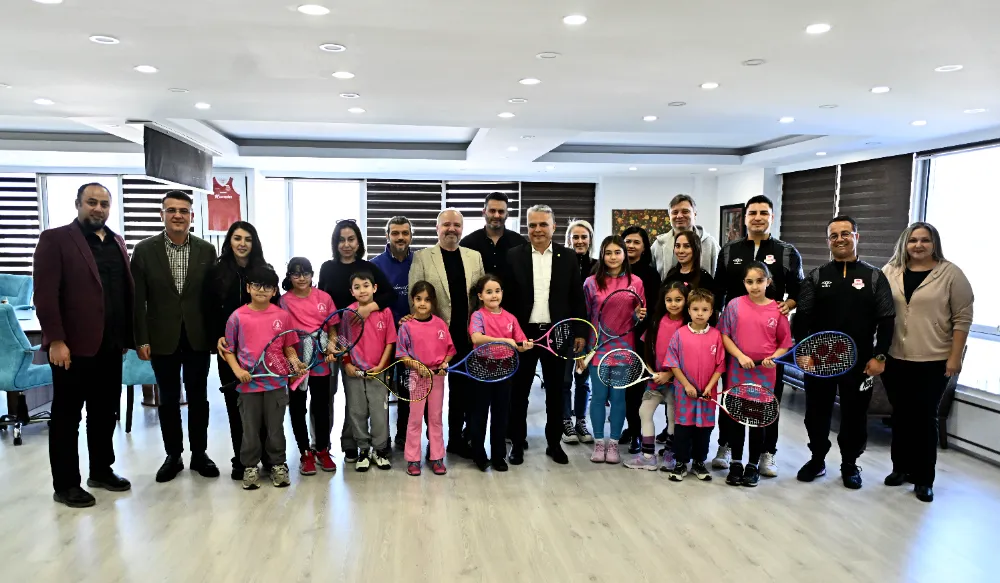Muratpaşa Belediyesi’nin lisanslı minik tenisçileri, Başkan Uysal’a çiçek takdim ederek spora ve