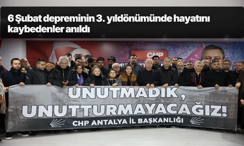 6 Şubat 2023’de Kahramanmaraş merkezli 11 ili kapsayan depremin 3’üncü yılı tüm yurtta olduğu gibi Antalya’da da çeşitli törenler ile anıldı. Antalya Büyükşehir Belediyesi Başkan Vekili Büşra Özdemir, Cumhuriyet Halk Partisi (CHP) İl Başkanlığı’nda gerçekleştirilen anma törenine katıldı. CHP Antalya İl Başkanı Nail Kamacı, CHP Parti Meclis Üyesi Önder Kurnaz ve partililerin katıldığı anma töreninde 6 Şubat depreminde hayatlarını kaybeden vatandaşlarımız için bir dakikalık saygı duruşunda bulunuldu.