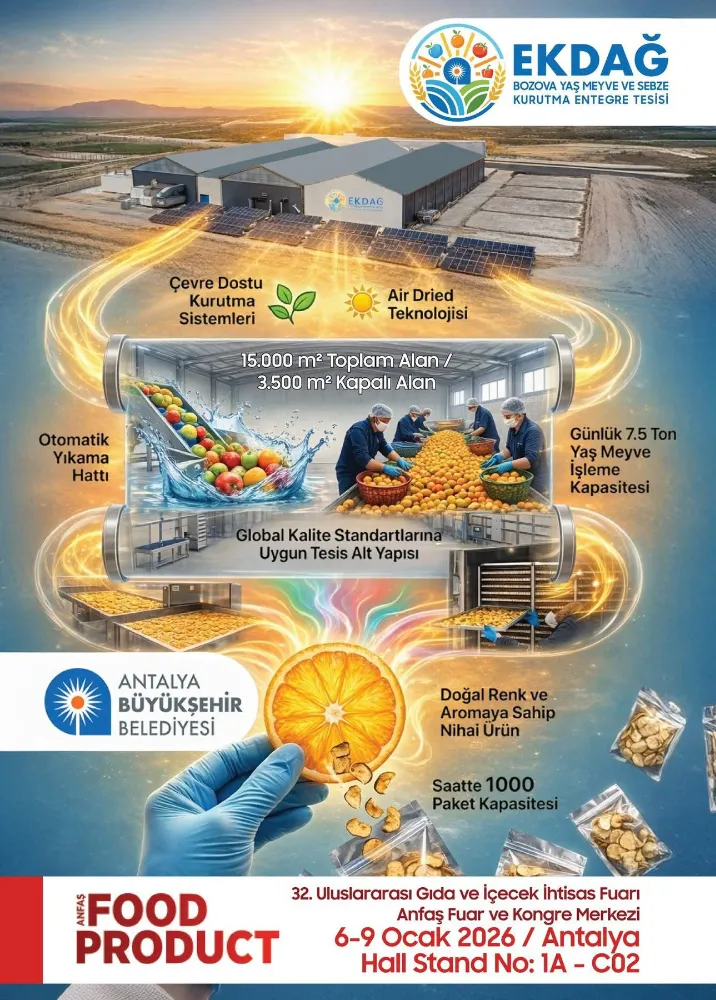 ANTALYA – Antalya Büyükşehir Belediyesi iştirak şirketi EKDAĞ A.Ş. bünyesinde faaliyet gösteren Bozova Kurutma Tesisi, 32. FoodProduct – Uluslararası Gıda ve İçecek İhtisas Fuarı’nda ürünlerini ziyaretçilerin beğenisine sundu. Antalya’nın bereketli topraklarında çiftçilerin emeğiyle yetiştirilen sebze ve meyveler, besin değerlerini koruyan modern kurutma teknolojileriyle işlenerek ANFAŞ’ta tanıtılıyor.