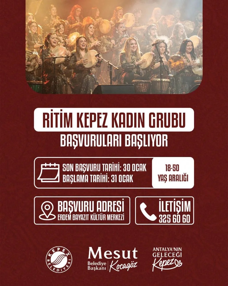 Kepez Belediyesi, kadınların sanatsal üretimde daha görünür ve aktif rol almasını sağlamak amacıyla kültür-sanat projelerine bir yenisini daha ekliyor. Müziğe ve ritme ilgi duyan kadınları buluşturacak olan Ritim Kepez Kadın Grubu, birlikte üretmek, sahne deneyimi kazanmak ve müziğin bir parçası olmak isteyen kadınlara yeni bir alan sunacak. 18–50 yaş aralığındaki kadınların başvurabileceği Ritim Kepez Kadın Grubu için başvurular 30 Ocak’ta sona erecek, 31 Ocak’ta eğitime başlanacak. Başvurular Erdem Bayazıt Kültür Merkezi’nden yapılacak. Detaylı bilgi almak isteyen vatandaşlar, (0242) 325 60 60 numaralı telefondan yetkililere ulaşabilecek.
